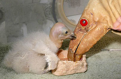 גוזל הקונדור הצעיר שבקע לפני יומיים בגן החיות בסאן-דייגו, קליפורניה, מקבל את מנת המזון היומית באמצעות בובת קונדור מיוחדת. עובדי המקום משתמשים באמצעי זה, התורם להסוואת נוכחותם בזמן האכלת הגוזלים. זהו הגוזל הראשון שבוקע העונה בגן החיות ובחודש הקרוב הוא ישהה בתוך אינקובטור מחומם על מנת שיוכלו לפקח מקרוב על התפתחותו ובריאותו.