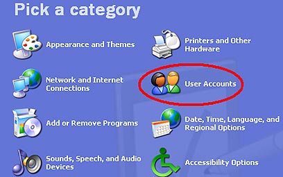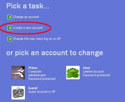 פתחו את לוח הבקרה (Control Panel), ואתרו בתוכו את User Accounts (ראו איור למעלה). התקינות המיקרוסופטית אומרת כי על כל מחשב צריך להיות לפחות אייקון אחד של זכר בהיר עור עם שיער בלונדיני קצר הלבוש בחליפה ירוקה ולפחות אייקון אחד של נקבה שחומת עור הלבושה בחליפה כחולה עם שיער שחור ותסרוקת קארה. לחיצה על האייקון הזה תציג את המסך המנהל את המשתמשים במחשב שלכם (צילום המסך למטה).