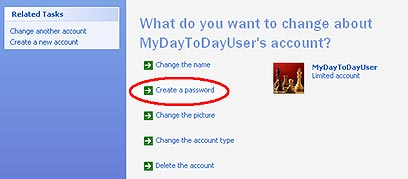 לאחר שנוצר החשבון תגלו להפתעתכם שברירת המחדל של המערכת היא – בניגוד לשכל הישר – לא לתת לחשבון סיסמת כניסה. זה כמו להתקין דלת פלדה חזקה ובלתי ניתנת לפריצה אבל לא להתקין עליה מנעול. ולכן, כדי לתקן את המעוות, בחרו בחשבון שפתחתם במסך ניהול החשבונות. במסך ניהול החשבון (ראו צילום המסך הבא) לחצו על "צור סיסמא".