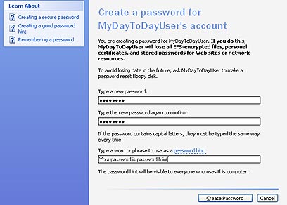 החלק החשוב ביותר במסך בחירת הסיסמה (ראו צילום המסך הבא) הוא שדה הרמז – השדה שנועד לאנשים שמרוב עודף יצירתיות שכחו מהי הסיסמה המקורית שלהם. בשדה זה אתם יכולים לספק לעצמכם רמז שרק אתם תבינו, שיזכירו לכם מה הייתה הסיסמה שבחרתם.