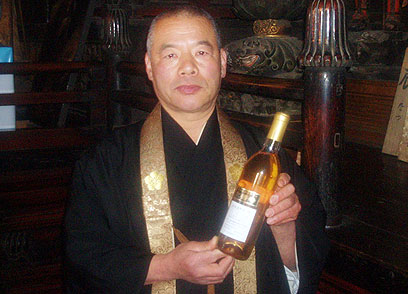הנזיר הבודהיסטי מציג לנו את היין הלבן שהם מיצרים במנזר גאה מאוד ביין שלו. אני שואלת את ראש המנזר כמה יין הוא נוהג לשתות ביום והוא מודה ללא בושה כלל: כחצי בקבוק. לא פלא שהחיוך לא יורד לו מהשפתיים. כיף להיות נזיר ביפן.