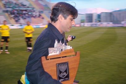 אוחנה עם מגן ההוקרה שקיבל מבית"ר (צילום: יונתן האורסטוק)