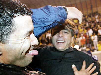 אוחנה ואלי טביב מאושרים אחרי הניצחון (צילום: ראובן שוורץ)