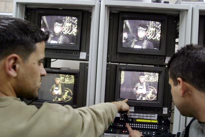 צופים ברמאללה בקלטת המחבל (צילום: איי.אף.פי)