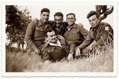 פגישת חברי מרחביה ולוחמים נוספים בסוף המלחמה (ינואר 1945): לושק גרול מהגדוד הראשון (מימין), ראובן שטרנברג מחיל התובלה (מלפנים), ראובן אשל מהגדוד השני (משמאל).