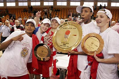 שחקניות הפועל ת"א עם הצלחת והרשתות (צילום: שאול גולן)