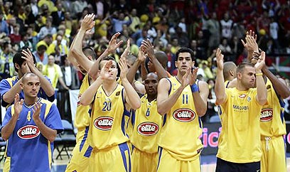 שחקני מכבי תל אביב מודים לקהל באולם בפראג, הערב (צילום: רויטרס)