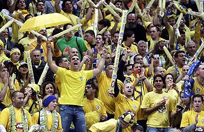 אוהדי מכבי תל אביב חוגגים ביציעי פראג, הערב (צילום: איי פי)