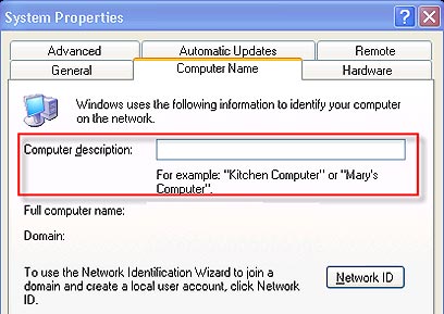 - לאחר שהמחשב יעלה, הקליקו על הלחצן הימני בעכבר ימני על "המחשב שלי בשולחן העבודה", לחצו על הלשונית "שם המחשב" ואז על כפתור "שנה". בשדה "שם המחשב" העניקו שם ייחודי ופשוט למחשבכם, באותיות אנגליות. בשדה "קבוצת עבודה" אפשר להשאיר את הכיתוב הקיים: MSHOME או WORKGROUP.