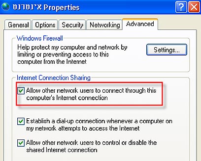 - לחצו על הלשונית "מתקדם" וסמנו V באפשרות השנייה (הרשו למשתמשים אחרים ברשת להתחבר). לאחר שתעשו זאת, ייפתחו להגדרה גם האפשרויות השלישית והרביעית. סמנו V גם באפשרות השלישית ("חייג בכל פעם שאחד המחשבים ברשת").