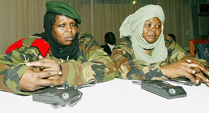 הלילה (יום ב') הודיעו בכירי האיחוד האפריקני כי הסכימו להאריך ב-48 שעות נוספות את המועד האחרון שהוקצה לשיחות המשא ומתן בין נציגי סודן והמורדים בדרפור, זאת לאחר שהמורדים הודיעו אמש כי הם מסרבים לחתום על המסמך. בתמונה: מריים עבדאללה (משמאל) ורודה מוחמד, מפקדות בקבוצת המורדים תנועת השיחרור הסודנית הלוקחות חלק בשיחות הנערכות בניגריה. (צילום: רויטרס)