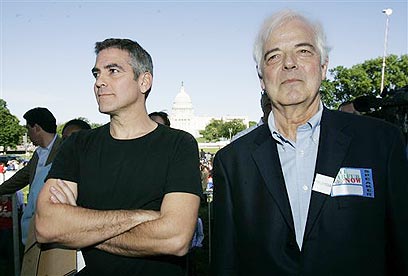 ואיך אפשר בלי כוכבים: בין המפורסמים הרבים שהגיעו להפגנה ואף נאמו בפני הנוכחים, נמנה גם השחקן ג'ורג' קלוני, שהגיע למקום עם אביו, ניק. (צילום איי.פי)