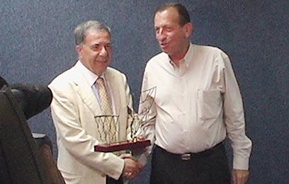 חולדאי ושמעון מזרחי, עם הפסלון שהוענק ליו"ר מכבי (צילום: איתי שנקמן)