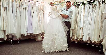 יעקב אטלס מעמותת "יד אברהם" עם מבחר השמלות. יש גם הינומות ונעליים