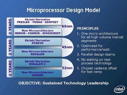 על פי מידע שפירסמה אינטל, בחברה מתחייבים מעכשיו להשיק כל שנתיים גם מיקרוארכיטקטורה חדשה, לפחות עד 2010, אם כי סביר להניח שהחידושים לא יהיו מהפכניים