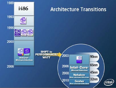 על פי מידע שפירסמה אינטל, בחברה מתחייבים מעכשיו להשיק כל שנתיים גם מיקרוארכיטקטורה חדשה, לפחות עד 2010, אם כי סביר להניח שהחידושים לא יהיו מהפכניים כמו במעבר הקרוב מ-NetBurst ל-Core: