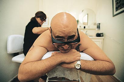 אבל ככל שהלכו וחלפו להן הדקות הבנתי שאין מפלט מקרני הלייזר והתמכרתי לדקירות החדות האלה, שמזכירות קעקוע על כל שטח הגב, הכתפיים והזרוע העליונה. שתי מחשבות סייעו לי להישאר במקום ובחיים: הראשונה היתה ש"לקמי יש אקדח, היא לא סתם שמחה לראות אותי", והשנייה היתה על הרגע שאפתח את עונת הרחצה רזה, שרירי וחלק.