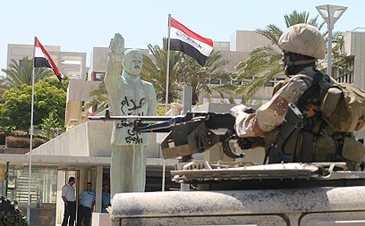 פסלו של סדאם חוסיין על רקע דגלי עיראק (צילום: ירון ברנר)