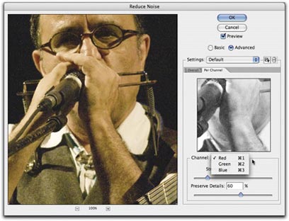 שימו לב כי לחלון הפילטר מצב מתקדם (Advanced) המאפשר להפחית את הרעשים ברמה שונה בכל ערוץ צבע.