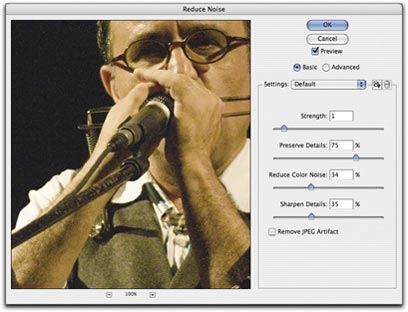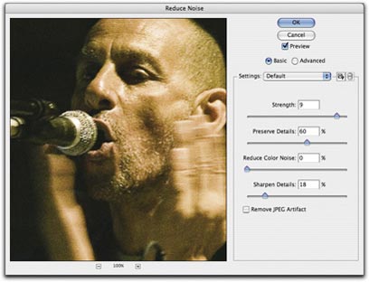 הדיגיטלים בתמונה: Noise>Reduce Noise. כדאי לדעת שהפחתת הרעשים מבוססת בעיקרה על טשטוש, לכן הפחתה מוגזמת של הרעשים עלולה לגרום לתחושת "גיהוץ" של התמונה.