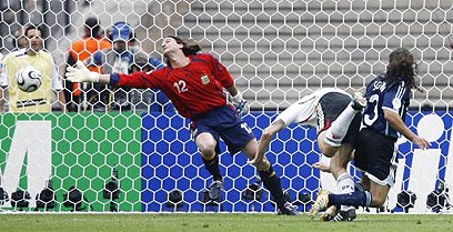 בעיטה ראשונה: אוליבר נויביל בועט לפינה הימנית של פרנקו, 0:1 לגרמניה.