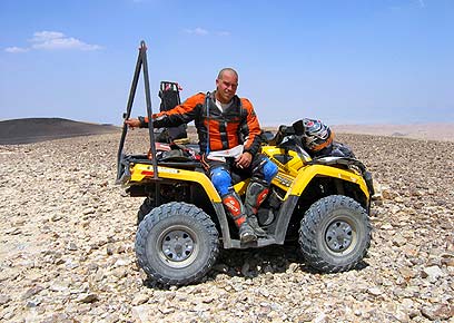 שלושה קילומטר של גרירה הביאו אותנו לצוות הסיוע - הרצל ובוריס. הרצל קפץ עלינו עם מים קרים וחתיכות מלון פרוס, בוריס קפץ על הטרקטורון של דני והתחיל לפרק אותו. הסתבר שרצועת ההינע קרועה. פחות משעה מאוחר יותר מצאנו עצמנו שוב נותנים גז. השלב הבא הביא אותנו לשבילים דרך כפרים בדואים. זה נראה כמו קטעים מהפאריז-דאקר, אתם יודעים, עם המקומיים שמנופפים לשלום ולמצלמת המסוק שמרחפת מעל. עד שאחד הילדים צרח עלי "תביא כסף!", ודפק לי שתי אבנים ענקיות בטרקטורון. זה היה השלב בו התחלנו לרכב ממש מהר.
