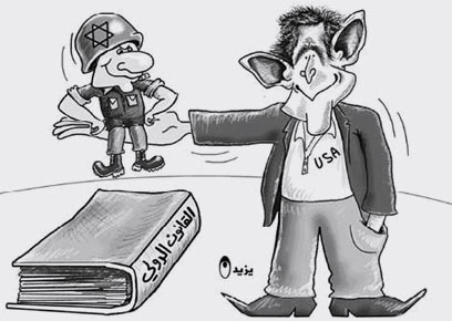הקהיליה הבינלאומית, לפי הקריקטורות היא זו שנותנת הכשר לכל פעולותיה של ישראל. בקריקטורה הבוקר מהעיתון "א-שרק אל-אווסט" ניתן לראות כי הקהילה הבינלאומית מתירה לישראל להשתמש בפצצות קטנות יותר מול הפלסטינים: