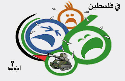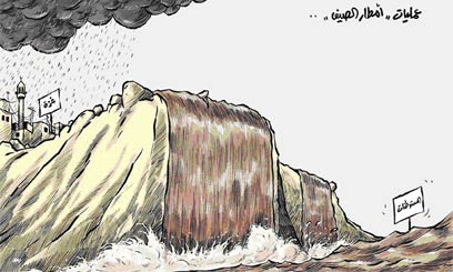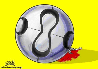 בעולם הערבי יודעים לתאר את הפעולות הצבאיות של ישראל נגד העם הפלסטיני כגחמה אלימה וכמענה שלילי להצעות השלום הערביות. בחסות המונדיאל ישראל חומקת מביקורת בינלאומית וגורמת למרחץ דמים ברצועה. כך מתייחסים המאיירים הערבים למבצע "גשמי קיץ"