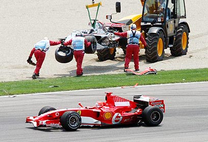 המירוץ האחרון של מונטויה, בארה"ב, הסתיים בתאונה. כך נגמרה הקריירה. בתמונה: שומאכר עוקף את מכונית המקלארן המעוכה (צילום: רויטרס)