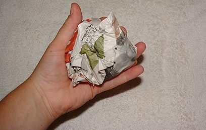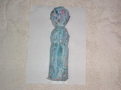 כעת, נכין כדור מדף עיתון ע"י גלגולו. נעטוף אותו בדבק נייר בכדי למנוע את פתיחת הנייר, ונצפה גם אותו ברצועות עיתון טבולות בדבק פלסטי. גם פה, כדאי לעטוף בארבע שכבות נייר, עד לקבלת מרקם חלק.