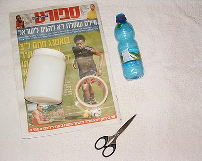 גוזרים את נייר העיתון לרצועות. טובלים את רצועות הנייר (אחת –אחת) בדבק פלסטי, ומניחים כל רצועה בנפרד על בקבוקי השתייה עד לציפוי מלא של הבקבוק. יש לחזור על פעולת הכיסוי המלא 4 פעמים (4 שכבות נייר).