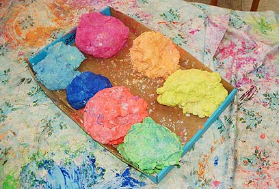 נכין עיסת נייר מנייר טואלט ונחלק אותה למספר קבוצות כמספר צבעי הגואש שיש לנו. כל קבוצת עיסה נלוש היטב עם צבע גואש בגוון אחר וכך נקבל עיסת נייר בכמה צבעים.