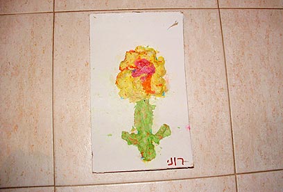 נתחיל להצמיד לדף הקרטון עיסת נייר בצבעים שונים לקבלת ציור מובלט. בתמונה: ציור תבליט של פרח באמצעות עיסת נייר. באותו האופן, אפשר לחתוך את הקרטון בצורת פרח, במרכזו להניח תמונה או מראה ואת עלי הכותרת למלא בעיסת הנייר.