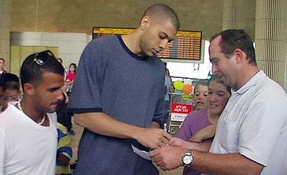 אנתוני פארקר חותם למעריצים, הבוקר בנתב"ג (צילום: יונתן האורסטוק)