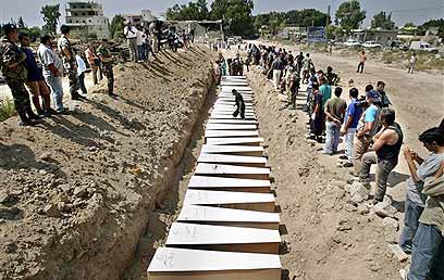 ארונות המתים הופנו למכה, כהני הדת השיעים נשאו תפילות חרישיות, ו-31 ארונות קבורה עשויים עץ הורדו בזה אחר זה אל מה שהפך עד מהרה לקבר אחים המוני, סמל ללחימה העקובה מדם המתנהלת בימים האחרונים בין ישראל ללבנון.
