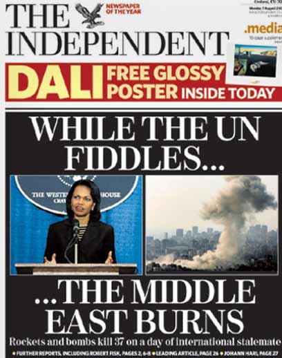 גם העיתון הבריטי "האינדפנדנט" הביע היום חוסר-סבלנות מכך שטרם נרשמה פריצת דרך במאמצים המדיניים. הכותרת הראשית שהתנוססה היום על שער העיתון היא "האו"ם מתבטל, בעוד שהמזרח התיכון בוער". כותרתו של מאמר המערכת של העיתון, "החלטה שאינה מציעה כל הפוגה בשפיכות הדמים", משקפת את דעתה של המערכת על הטיוטה שגיבשו ארה"ב וצרפת, שנוסחה אינו מונע את המשך הלחימה בין הצדדים.