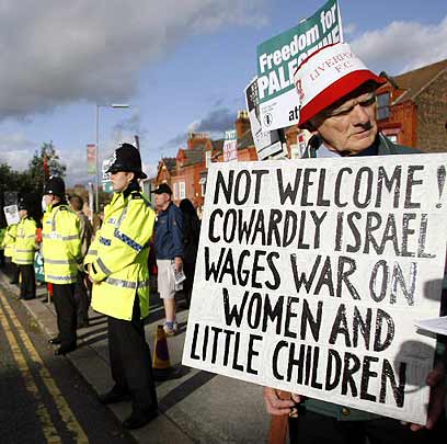 אוהד ליברפול עם שלט מחאה אנטי-ישראלי, לפני המשחק (צילום: רויטרס)