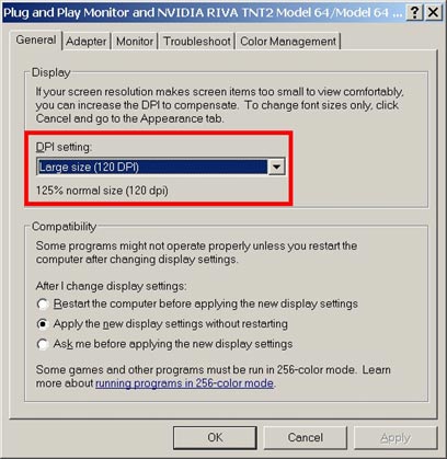 אם בתצוגה של 1024x768 הסמלים והתפריטים קטנים לכם מדי, תוכלו להסתפק ב-800x600 או להשתמש ב-1024x768 במצב Large Fonts: