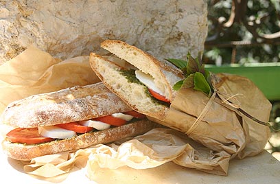 - חוצים את הג'בטה לשניים מורחים מהפסטו בנדיבות ומסרים פרוסות עגבניה ומוצרלה כרעפים, עוטפים היטב ובתיאבון.
