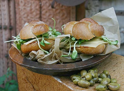- חוצים לשניים את הלחמניה הטריה מורחים ממרח העגבניות ומסדרים מעל פרוסות גבינה צהובה מוסיפים כמות נדיבה של נבטי חמניה טריים ועוטפים.