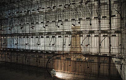 באותו חלל נמצאת הצבה של שוש טוויטו, שהעמידה שני קירות של לולי עופות ריקים. מהצד, לכל גובה הקיר, תלתה טוויטו יריעת רשת גדולה שלתוכה נשזרו נוצות עופות בגוונים שונים. הגוף המושתק, שנחשף לאכזריות ולהמתה, חוזר ועובר מטמורפוזה בפעולה עמלנית של שחזור. שלומי ללוש מציג סדרה של דיוקנאות אישיים מול מראה, בציורי פחם ובעבודת צבע אינטימית ועשירה בפרטים, מצוירת על גבי קרטון גלי ששוליו חשופים.