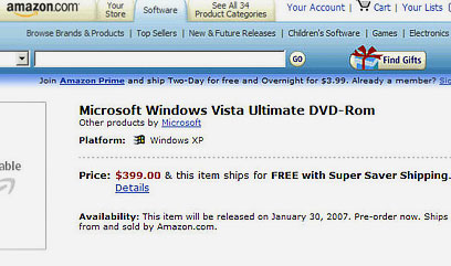 מערכת ההפעלה החדשה של מיקרוסופט כבר ניתנת לרכישה בהזמנה מוקדמת באתר הקניות Amazon, בעלות של 100 עד 400 דולרים. לפי האתר, Windows Vista תצא ב-30 בינואר, 2007