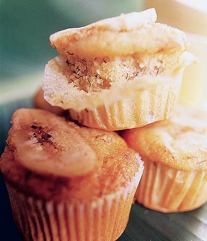 5. יוצקים את העיסה לתבניות, עד לשלושה רבעים מגובהן (או משטחים בתבנית מאורכת). מניחים פרוסת בננה מיובשת מעל לכל מאפין (או מסדרים את הפרוסות מעל לעיסה בתבנית). אופים 20-18 דקות (או 50 דקות בתבנית הגדולה), עד שפני המאפינס תופחים ומתקשים במקצת וקיסם הננעץ במרכז המאפה יוצא נקי.