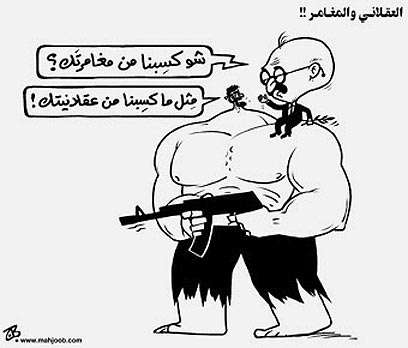 הקרב בין המוח לכוח בלבנון: "מה הרווחנו מההימור שלך?" שואל בעל המוח התומך בשלום את בעל הכוח. "את אותו הדבר שהרווחנו מהמוח שלך", עונה בעל הזרוע המניף את הרובה; "אל-קודס אל-ערבי" 30.8.2006