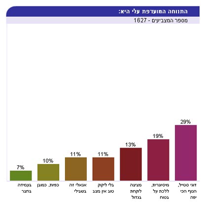 לקראת סיום השנה, הלכתי שוב אל הסקרים, לראות את התוצאות המצטברות, וביקשתי ממומחים בתחומים שונים להביע את דעותיהם. בינינו, הייתי משועשעת לגלות, שהסקר שמשך את מספר המשתתפים כמעט הכי גבוה (מיד אחרי זה שמדבר על נישואים בין-עדתיים) היה דווקא זה שעסק בתנוחה האהובה ביותר. אתם בסדר, חבר'ה, אם כי התוצאה, כפי שתראו בתמונת מסך המצורפת, מפתיעה למדי...