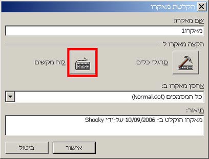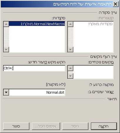 בחלק "הקצה מאקרו ל", תוכלו לבחור כיצד יופעל המאקרו - דרך כפתור חדש שיוצג באחד מסרגלי הכלים, או באמצעות צירוף מקשים. נדגים תחילה תוך שימוש בצירוף מקשים (אנחנו בחרנו בצירוף Ctrl+Shift+0 שמוצג בתור "Ctrl+(").