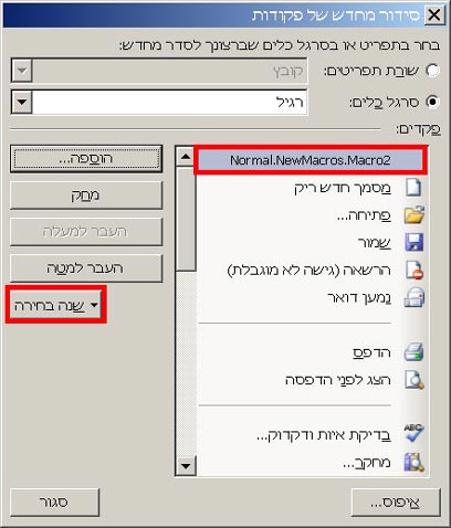 בשלב זה יופיע חלון התאמה אישית, בו יוצג חוצץ פקודות. בחלונית "פקודות" תראו את השם המלא של המאקרו החדש שלכם. הקליקו על הכפתור סידור מחדש של פקודות.