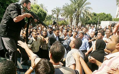 מאבטחיו של הנייה מפנים נשק כלפי המפגינים (צילום: רויטרס)