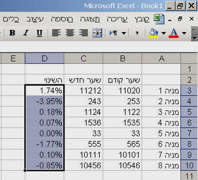 נשתמש כדוגמה בגיליון דמיוני עם שערי מניות. בעמודה B מופיע השער הקודם, בעמודה C מופיע השער החדש, ובעמודה D מופיע השינוי.