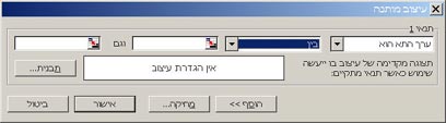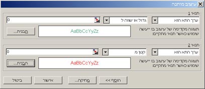 מאשרים. מקליקים על הכפתור הוסף בתחתית החלון, ויוצרים בצורה דומה תנאי נוסף (תנאי 2). הפעם נבחר לצבוע את תוכן התא באדום, כאשר ערכו קטן מ-0.
